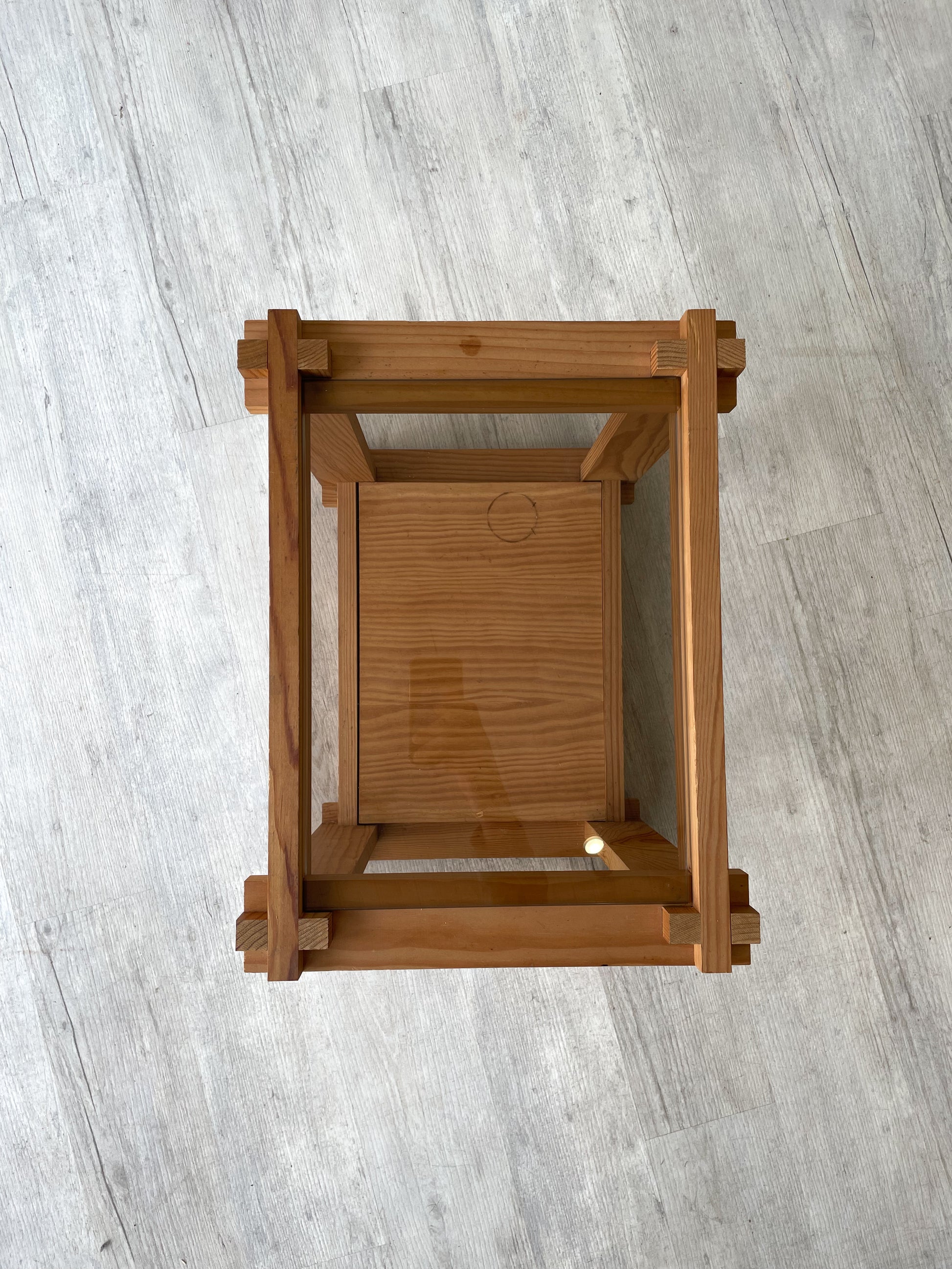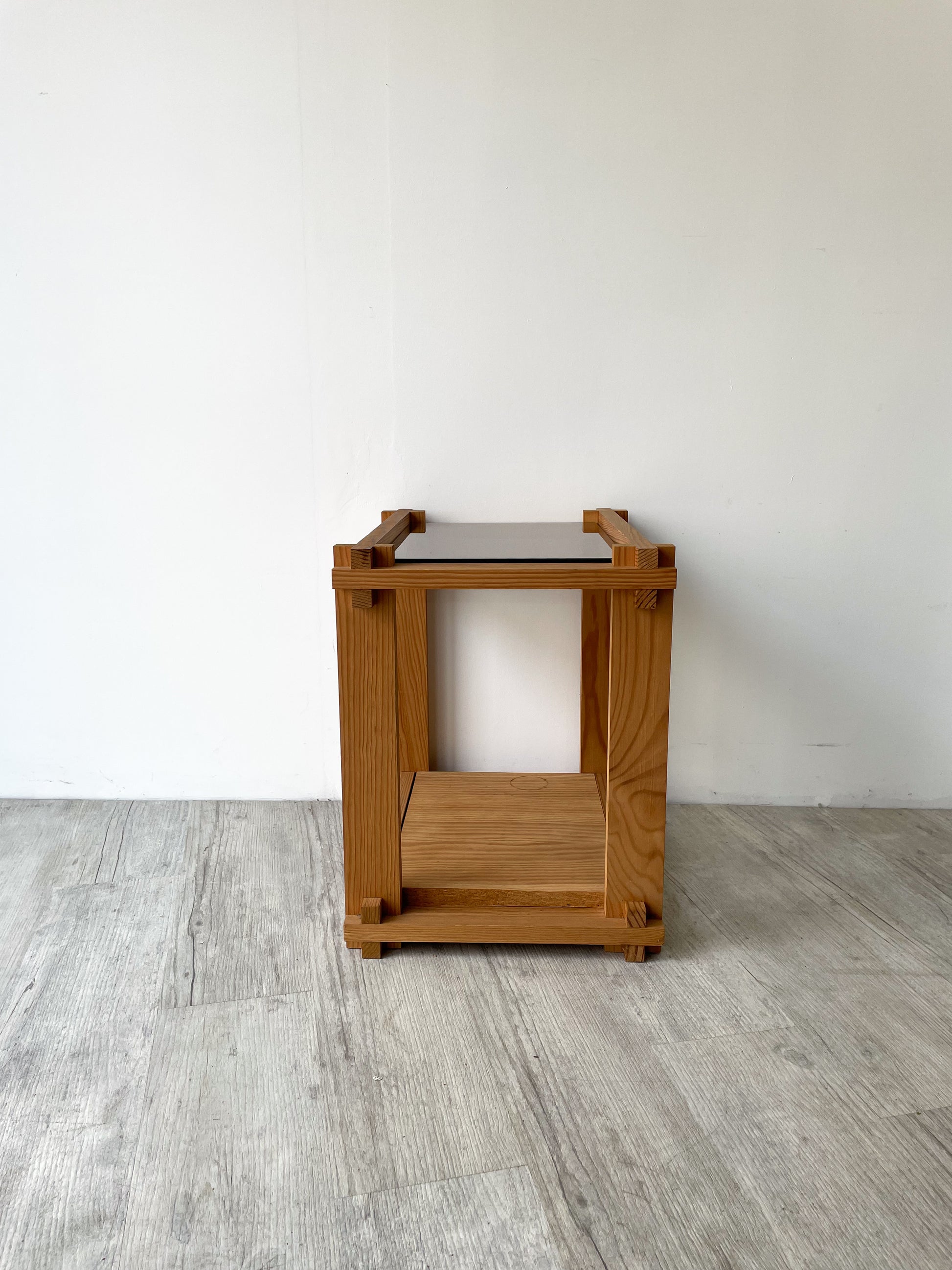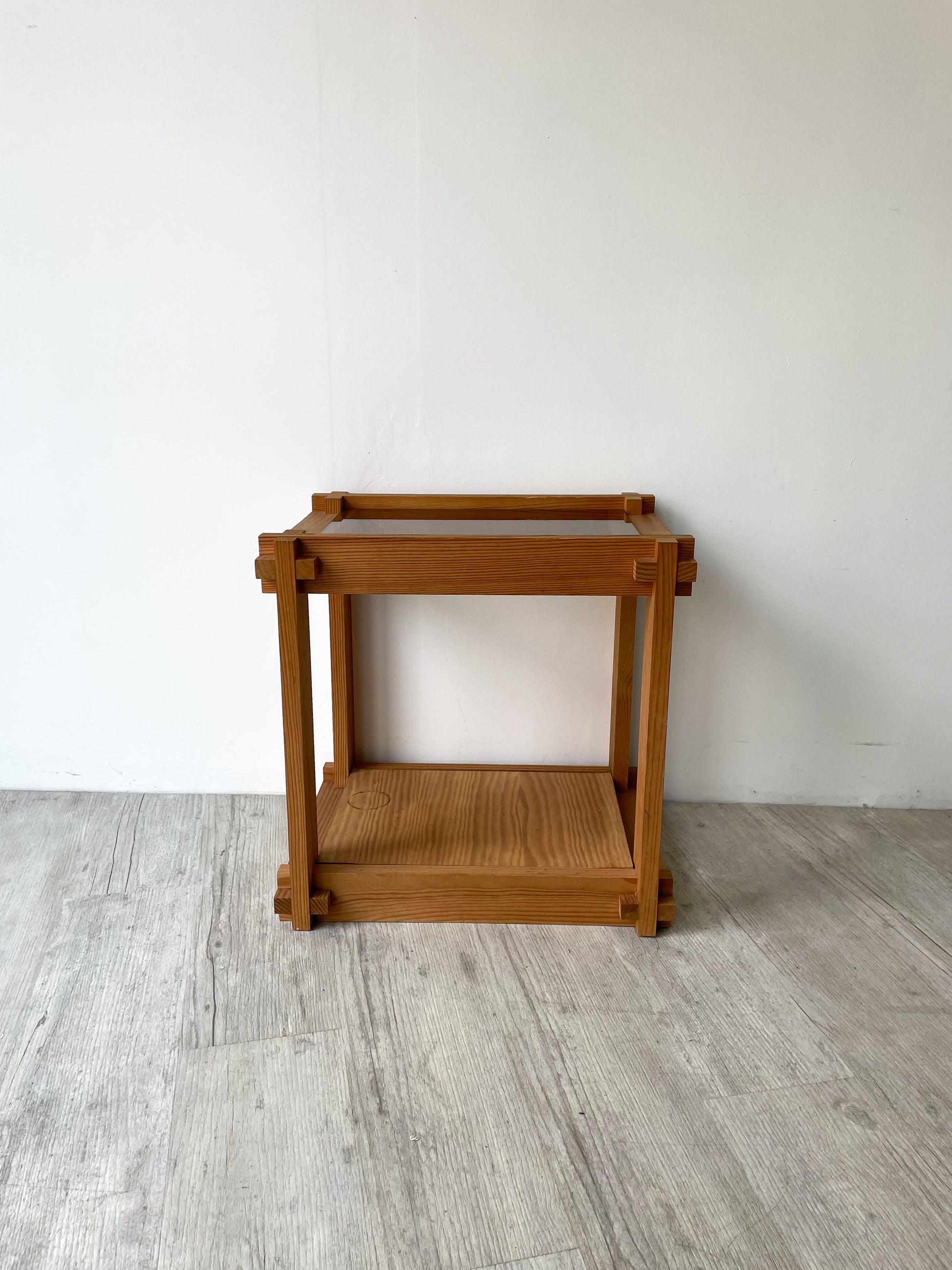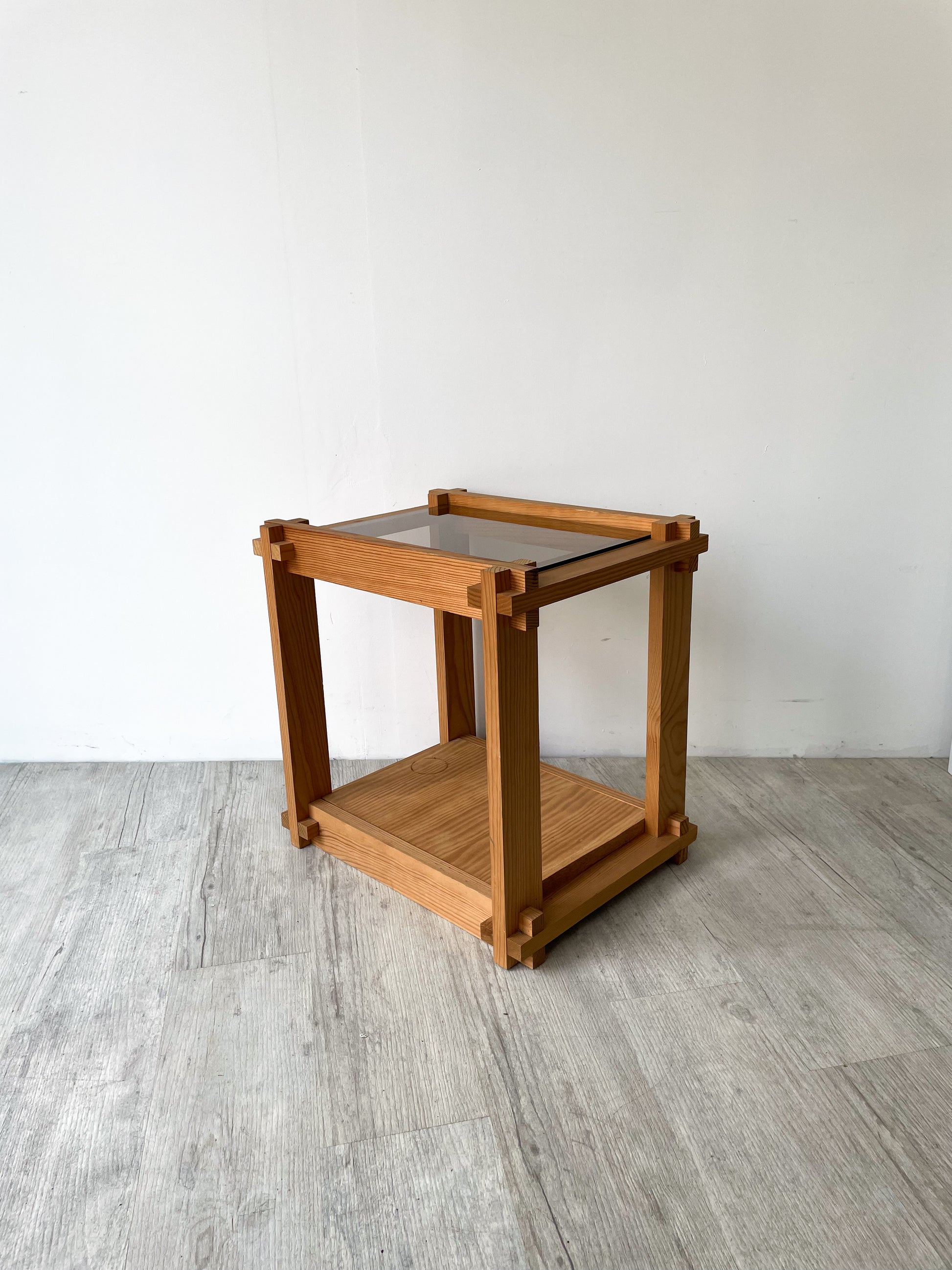 Joli bout de canapé ou table basse en pin, produite dans les années 70/80'. Elle est composée d'une structure, d'une tablette en bois en bas et d'un plateau en verre fumé en haut.