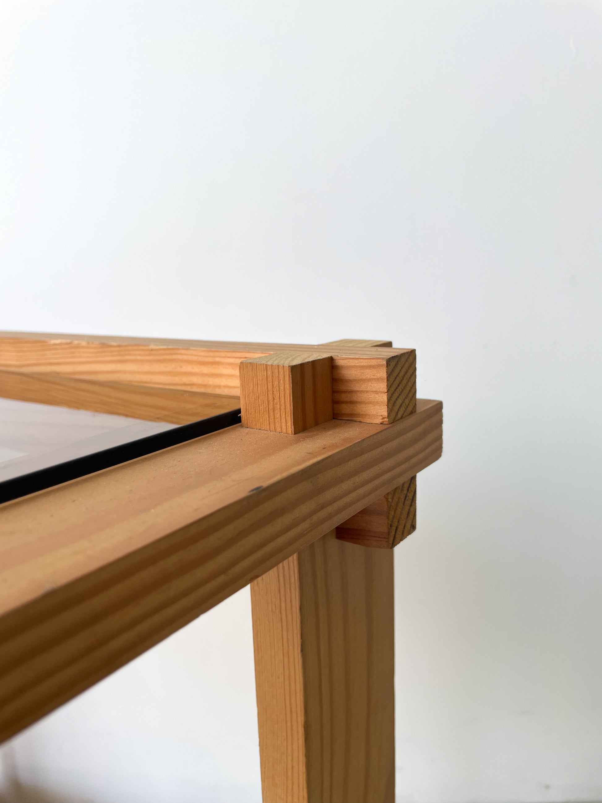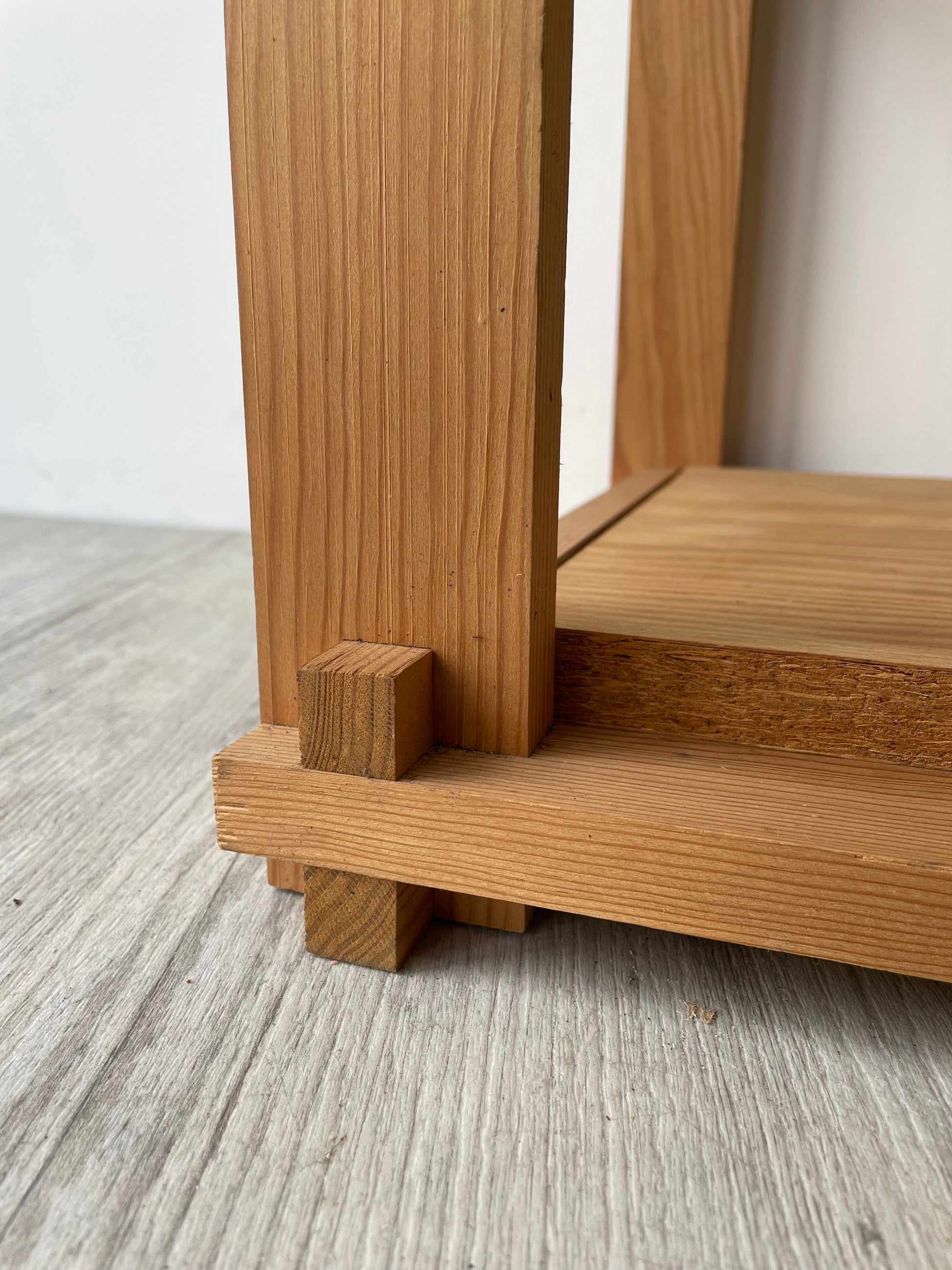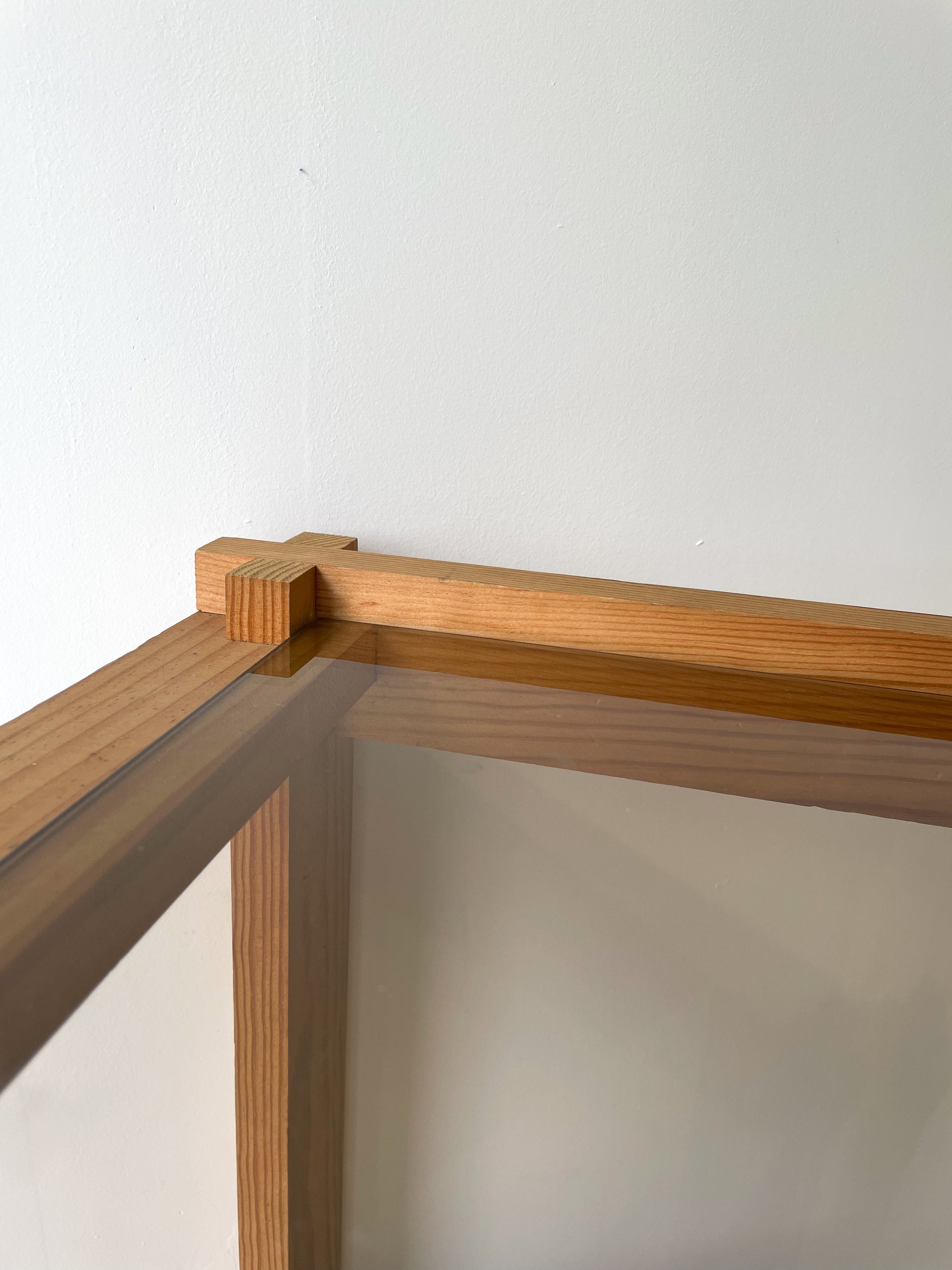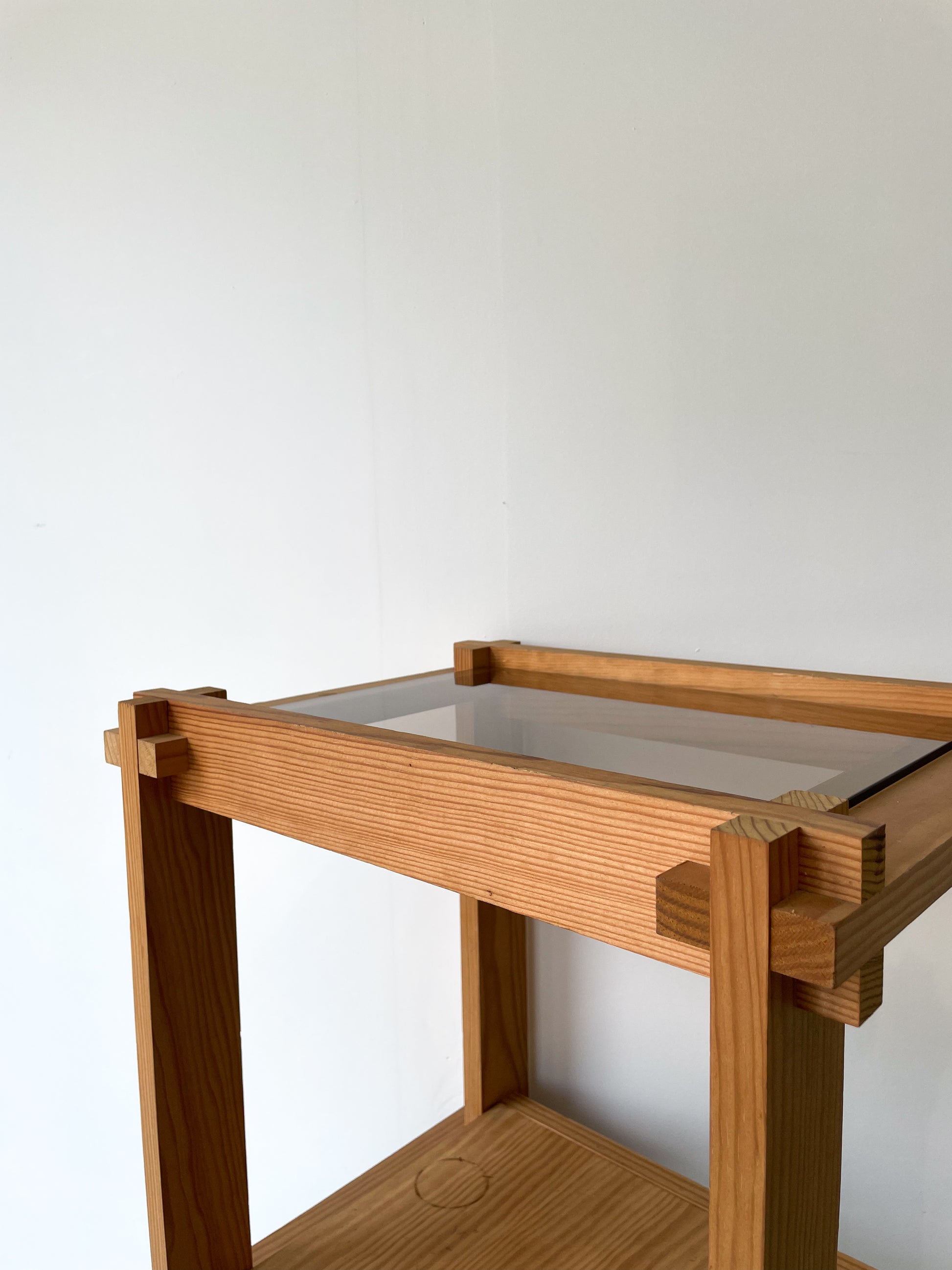 Joli bout de canapé ou table basse en pin, produite dans les années 70/80'. Elle est composée d'une structure, d'une tablette en bois en bas et d'un plateau en verre fumé en haut.