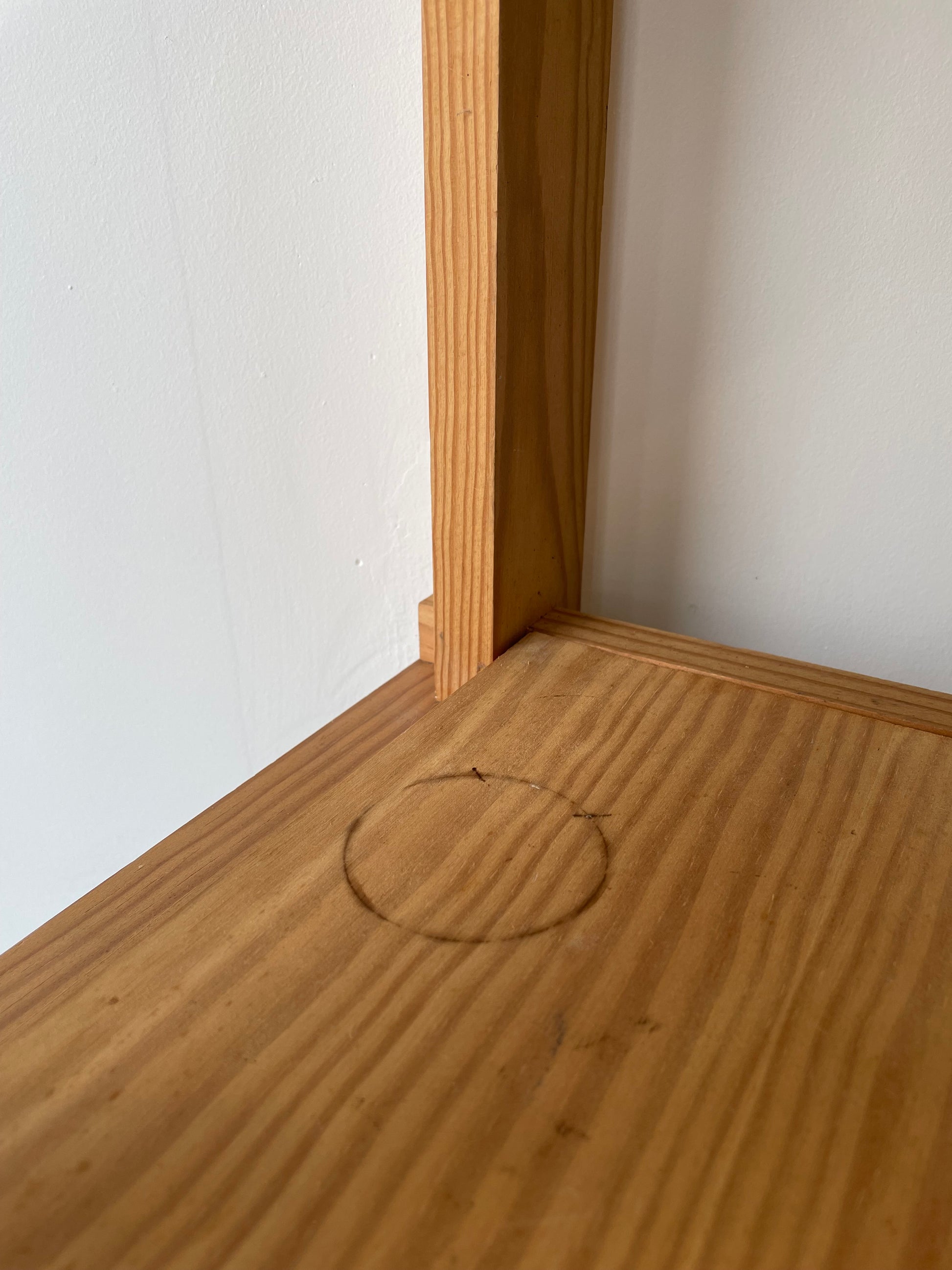 Elle est en très bon état. A noter une trace de verre sur le plateau en bois visible sur les photos.
