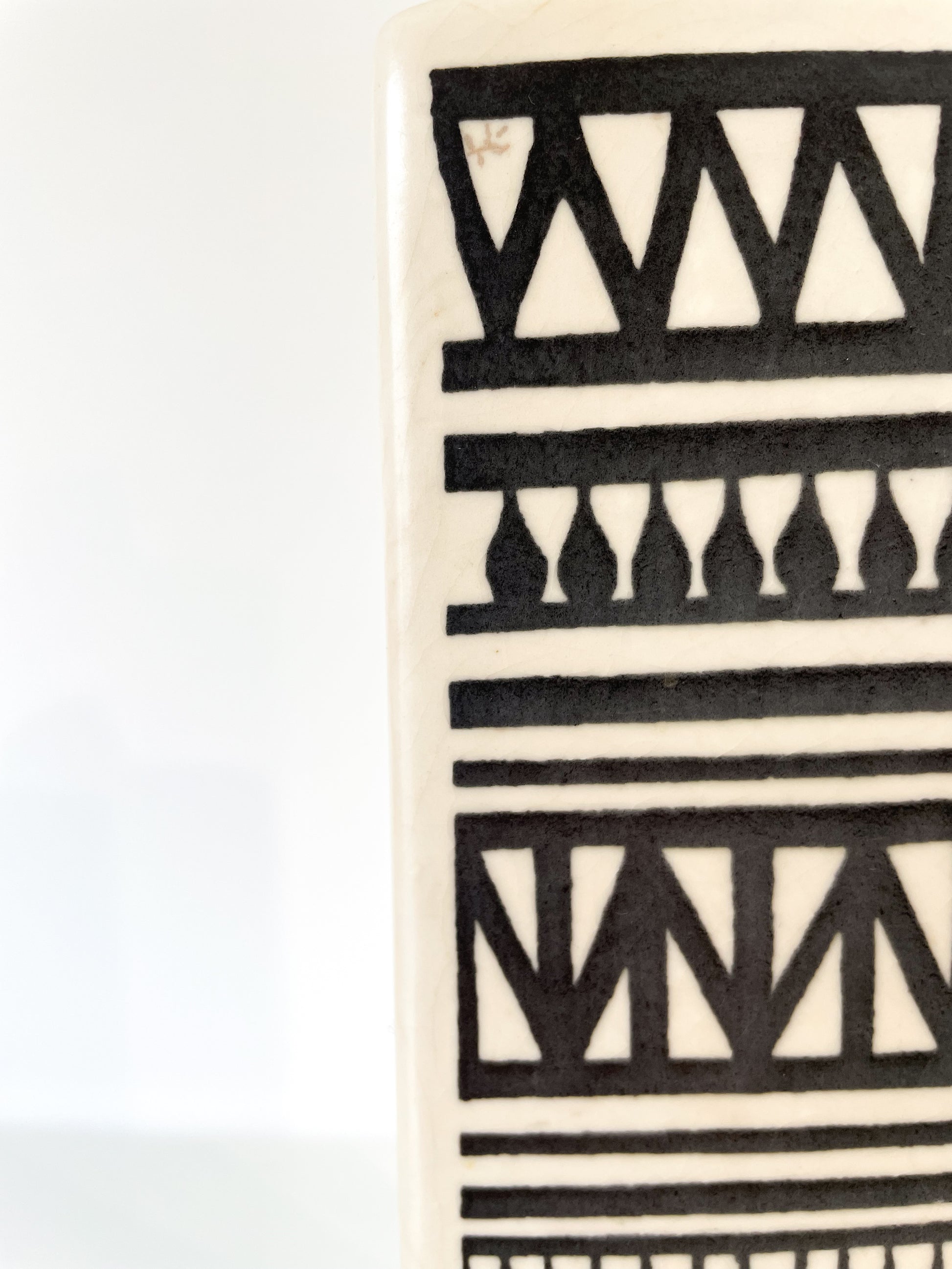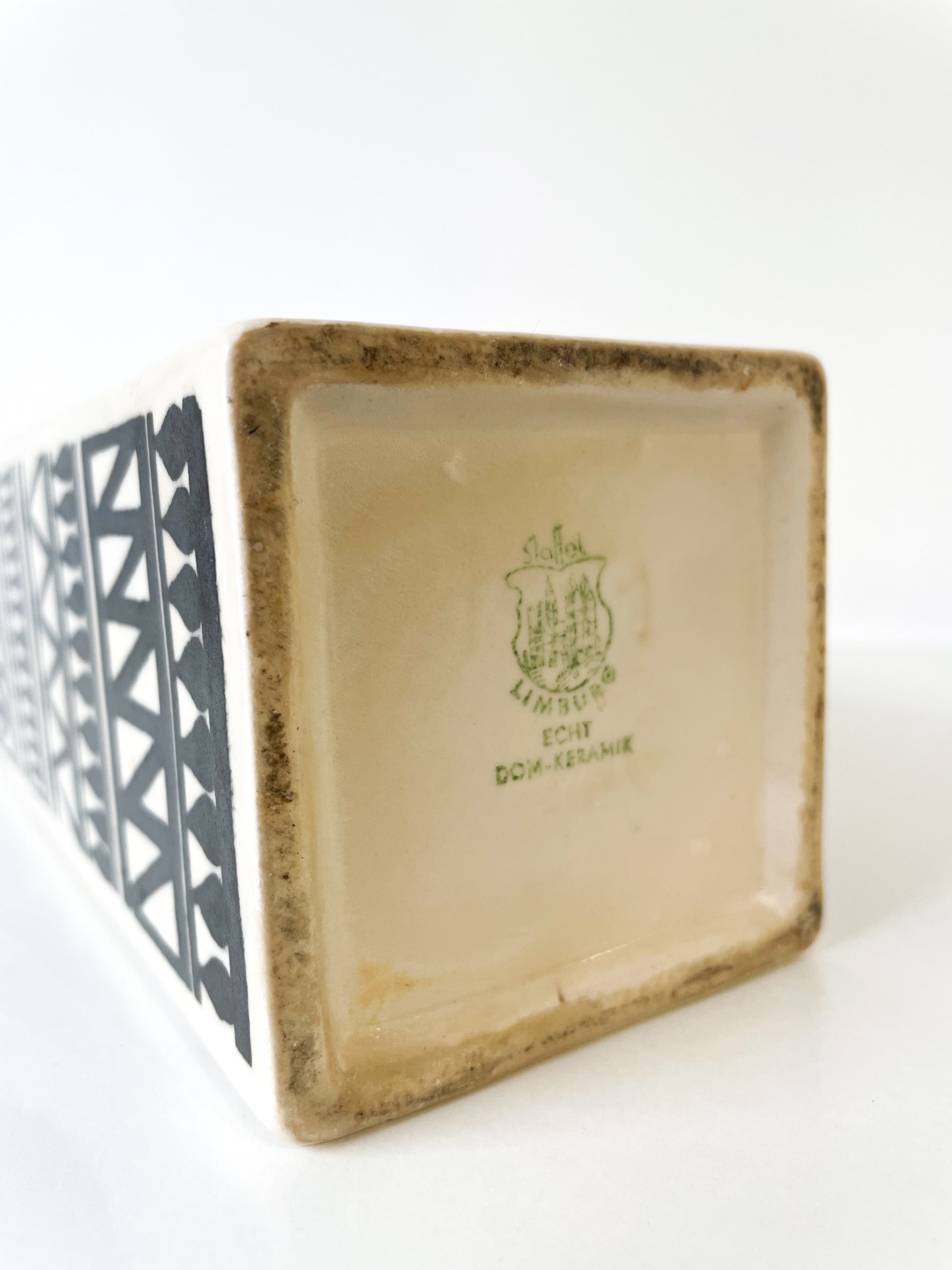Belle bouteille en céramique du milieu du siècle, à décor géométrique, par Staffel Limburg en Allemagne. Ici on adore ce modèle, c'est un vrai coup de coeur, et sommes persuadés qu'il fera la différence pour votre intérieur. Vous pourrez y conserver une boisson ou simplement le placer en objet déco.