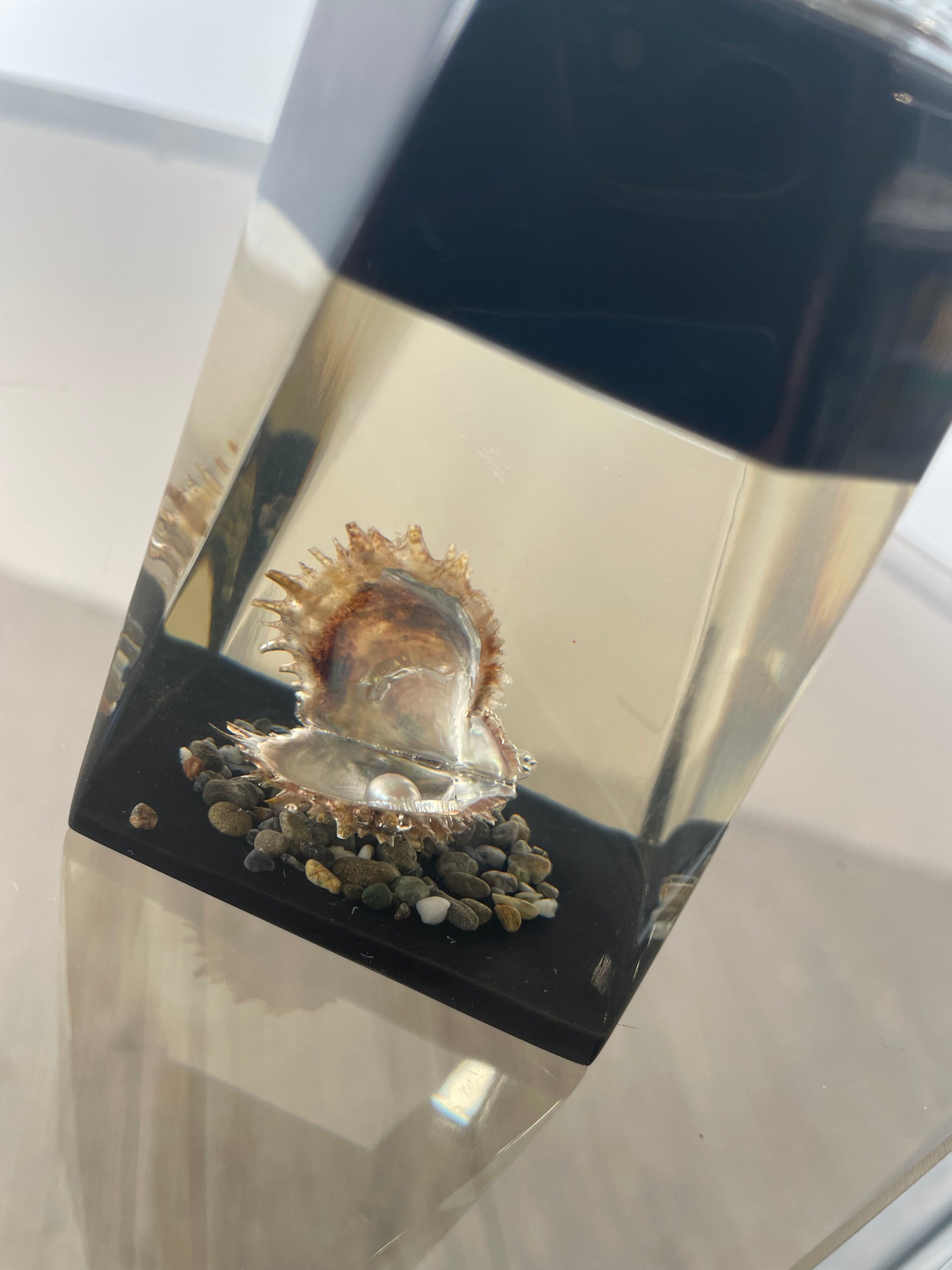 Jolie briquet déco en résine, avec huitre perlée. Un bel objet à installer sur votre étagère déco !