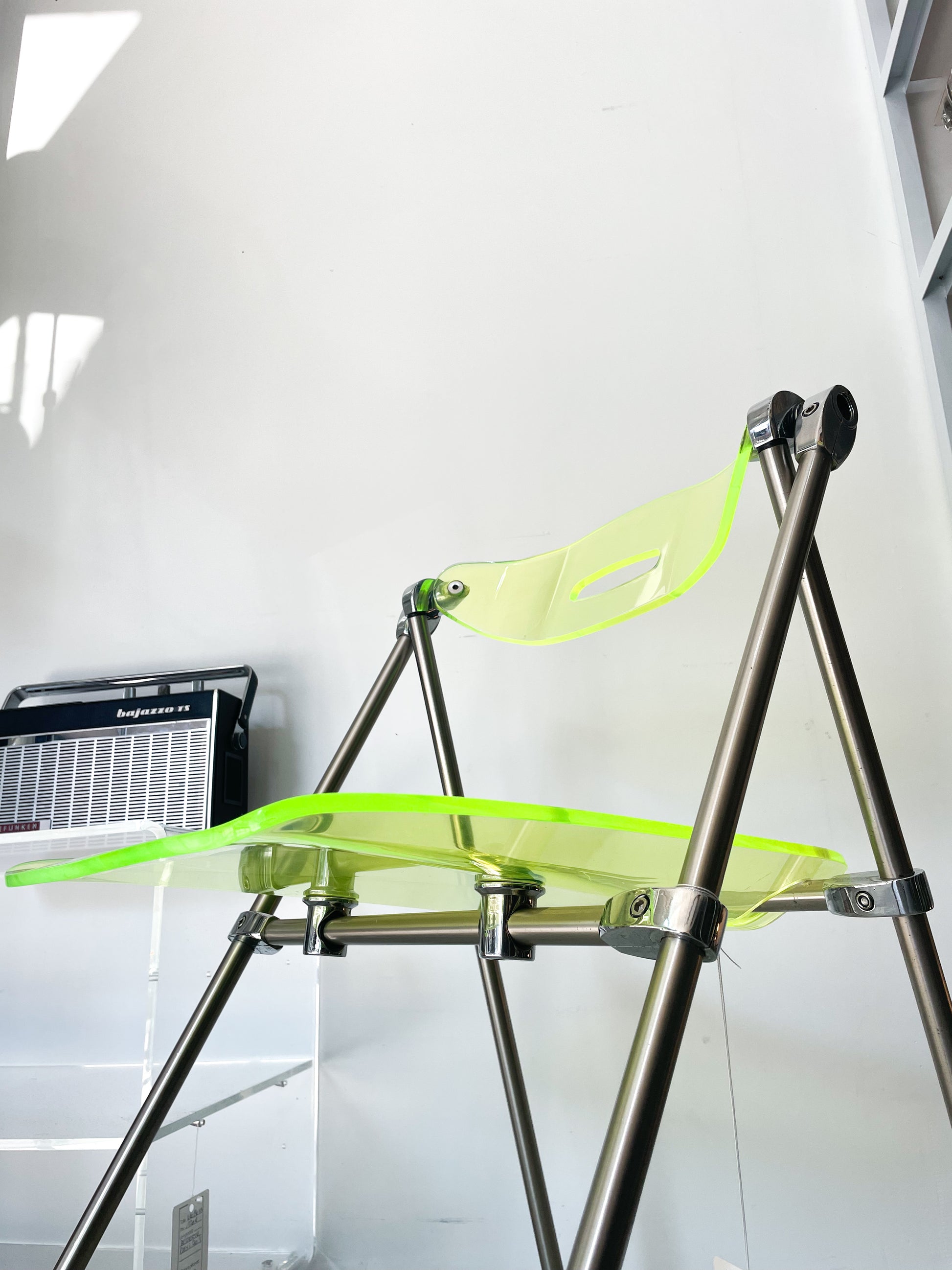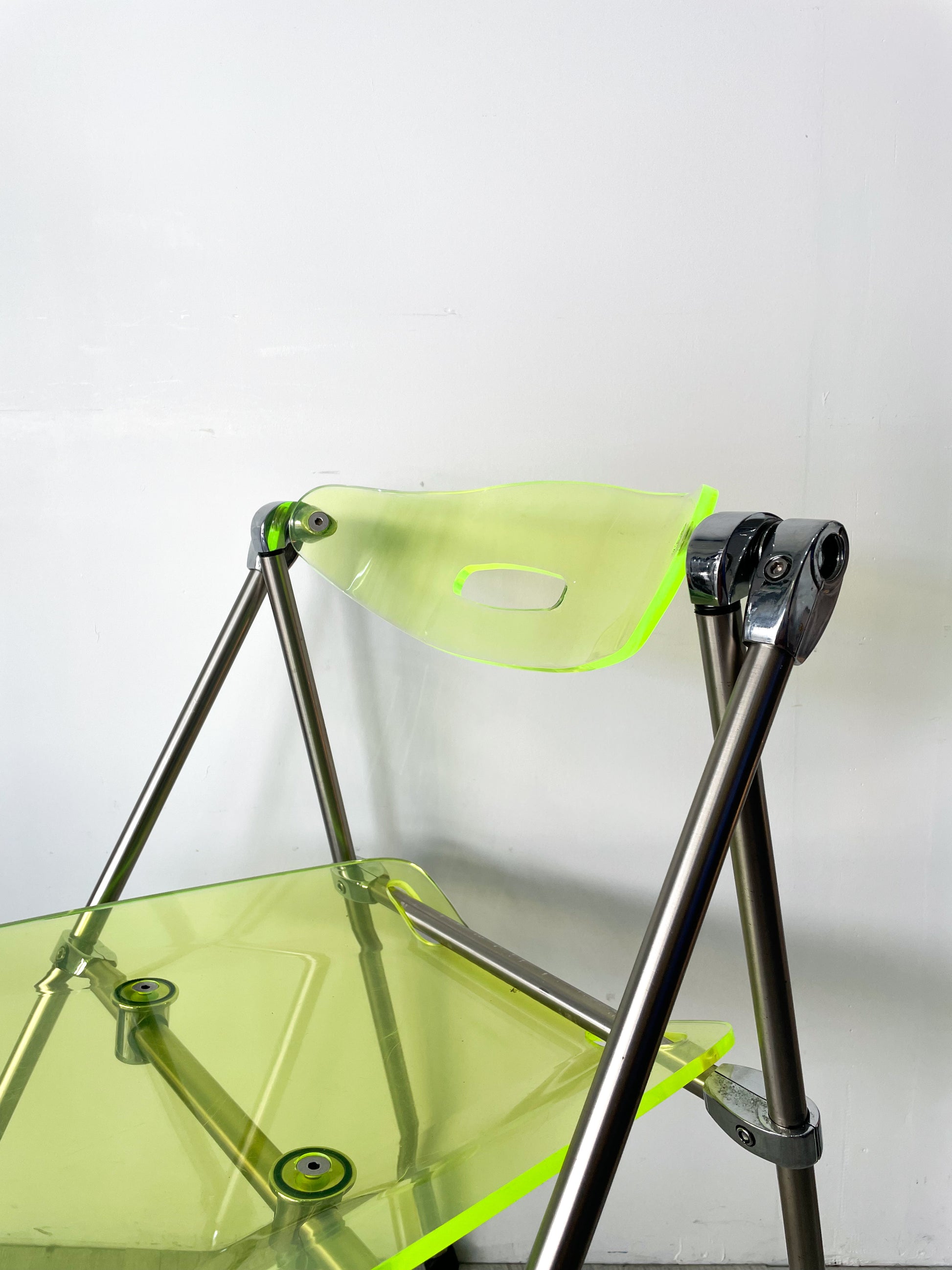 Chaise pliante des années 70 oeuvre de Giancarlo Piretti pour Castelli, assise en plexi jaune fluo et structure tubulaire en métal chromé.