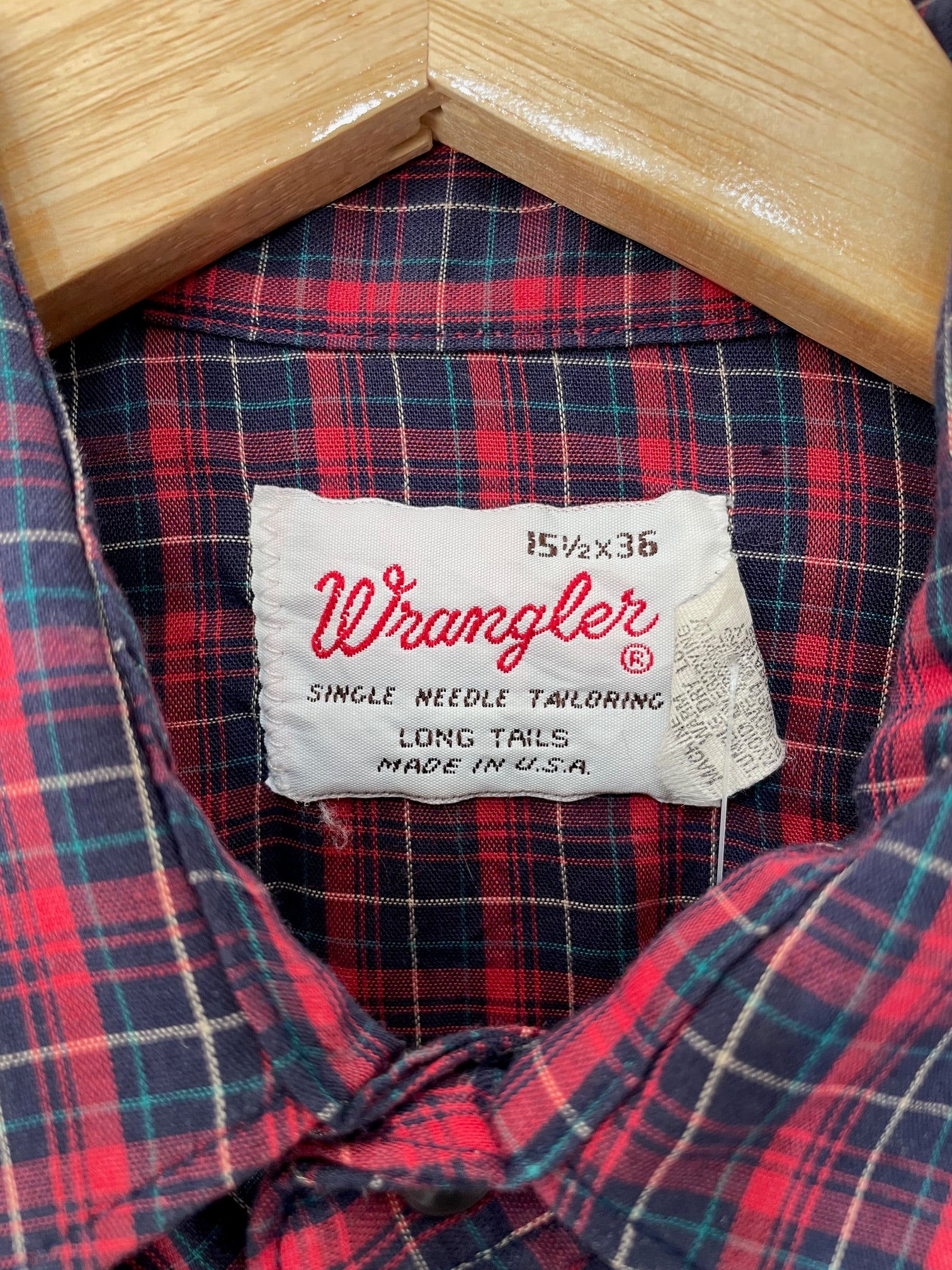 Cette chemise Wrangler vintage made in USA à carreaux rouges et bleus est un pur concentré d’authenticité : coupe western, pressions nacrées, finitions robustes…