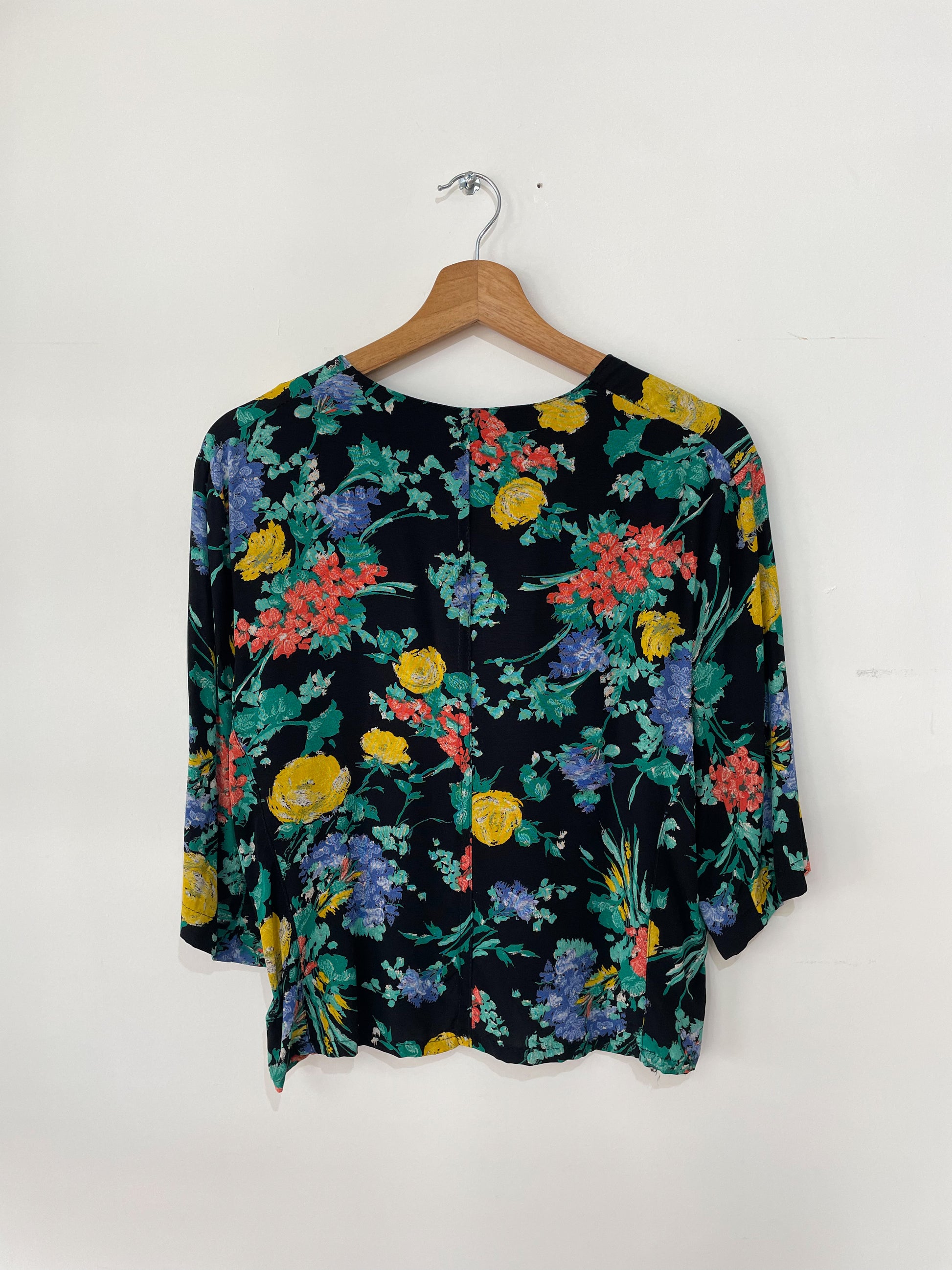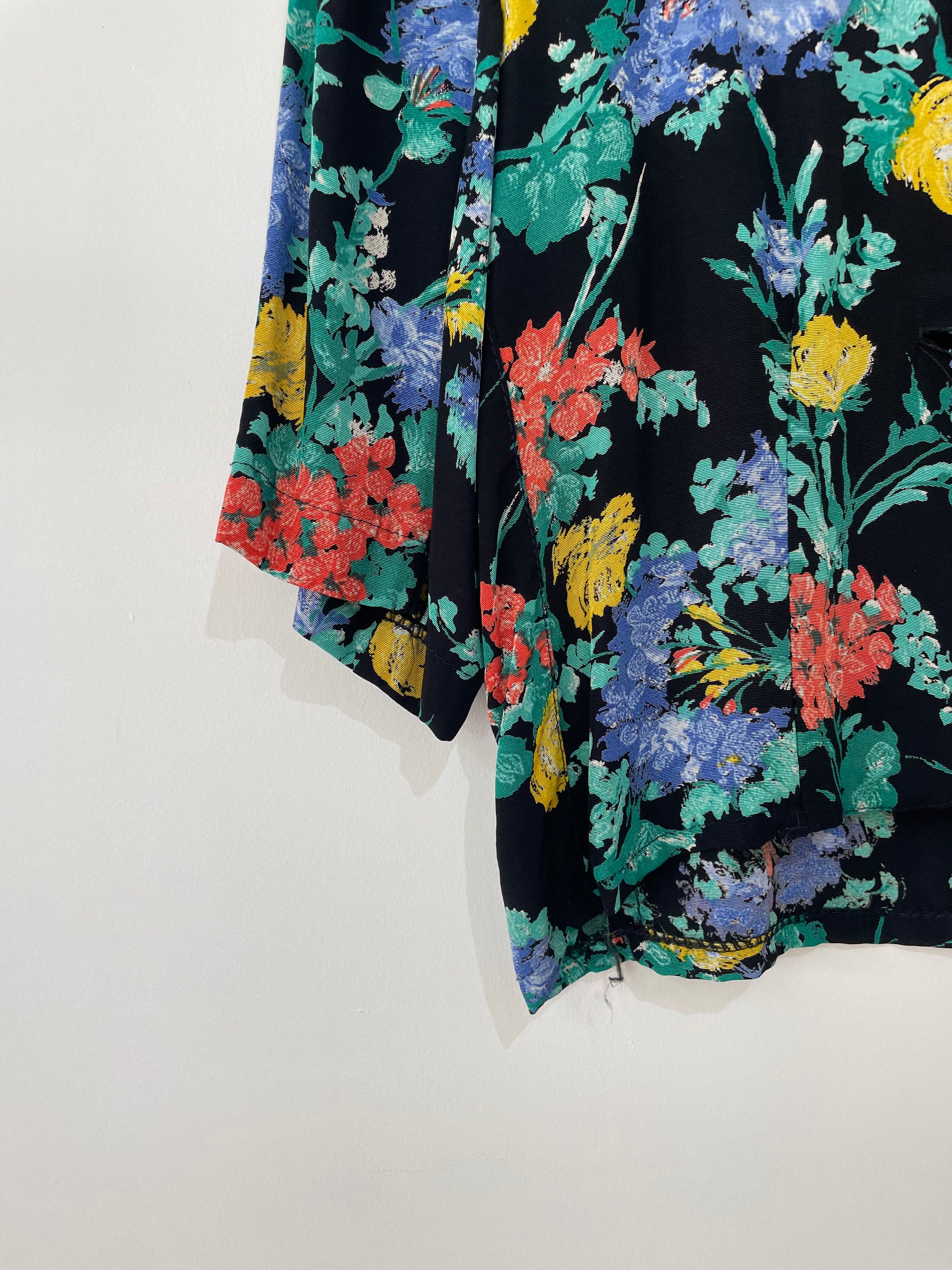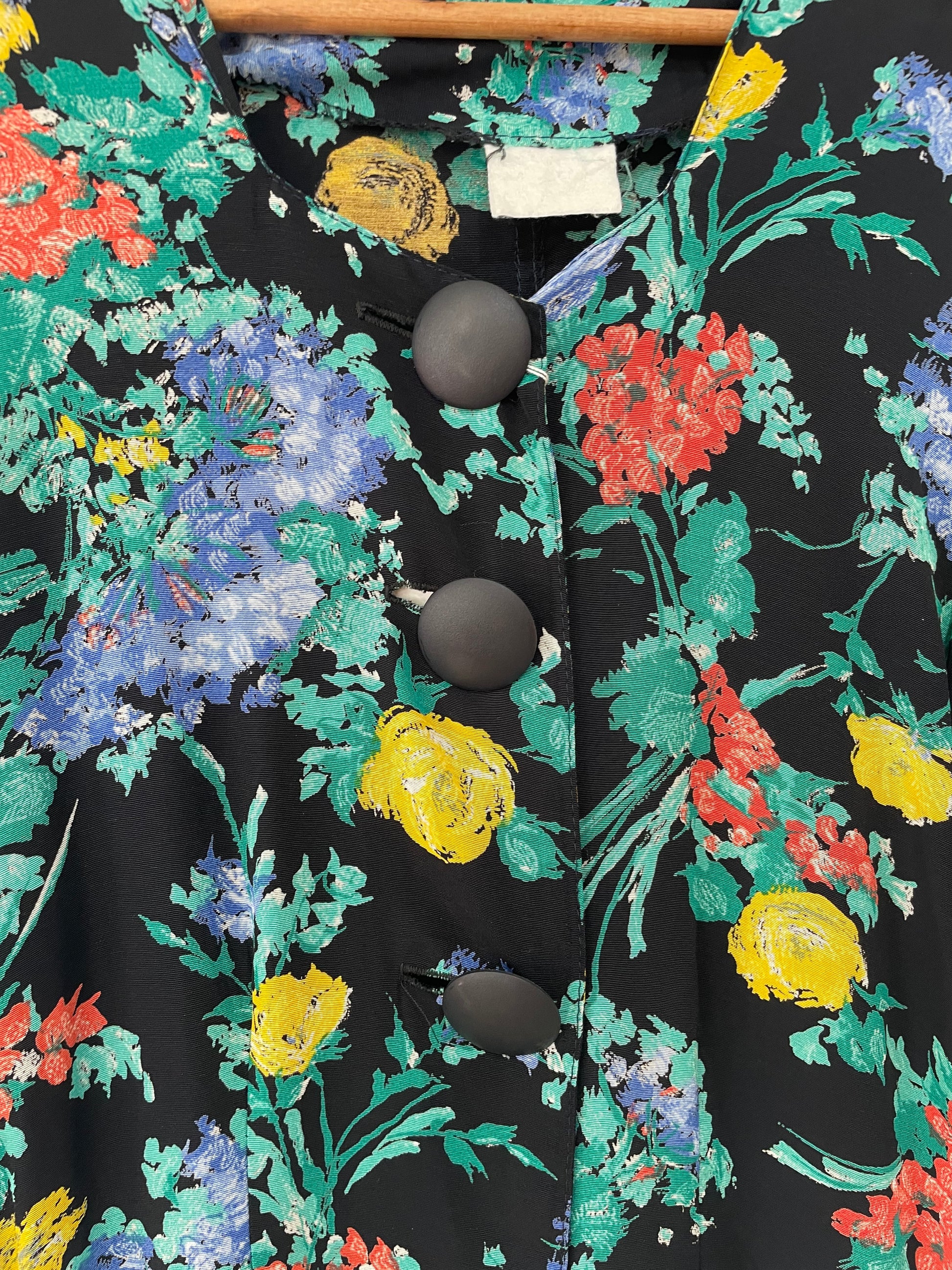 Belle chemise à fleurs, fabriquée en Italie dans les années 80's. On aime ses couleurs éclatante, sa coupe décontractée, la légère té du tissu, et ses gros boutons noirs so vintage !