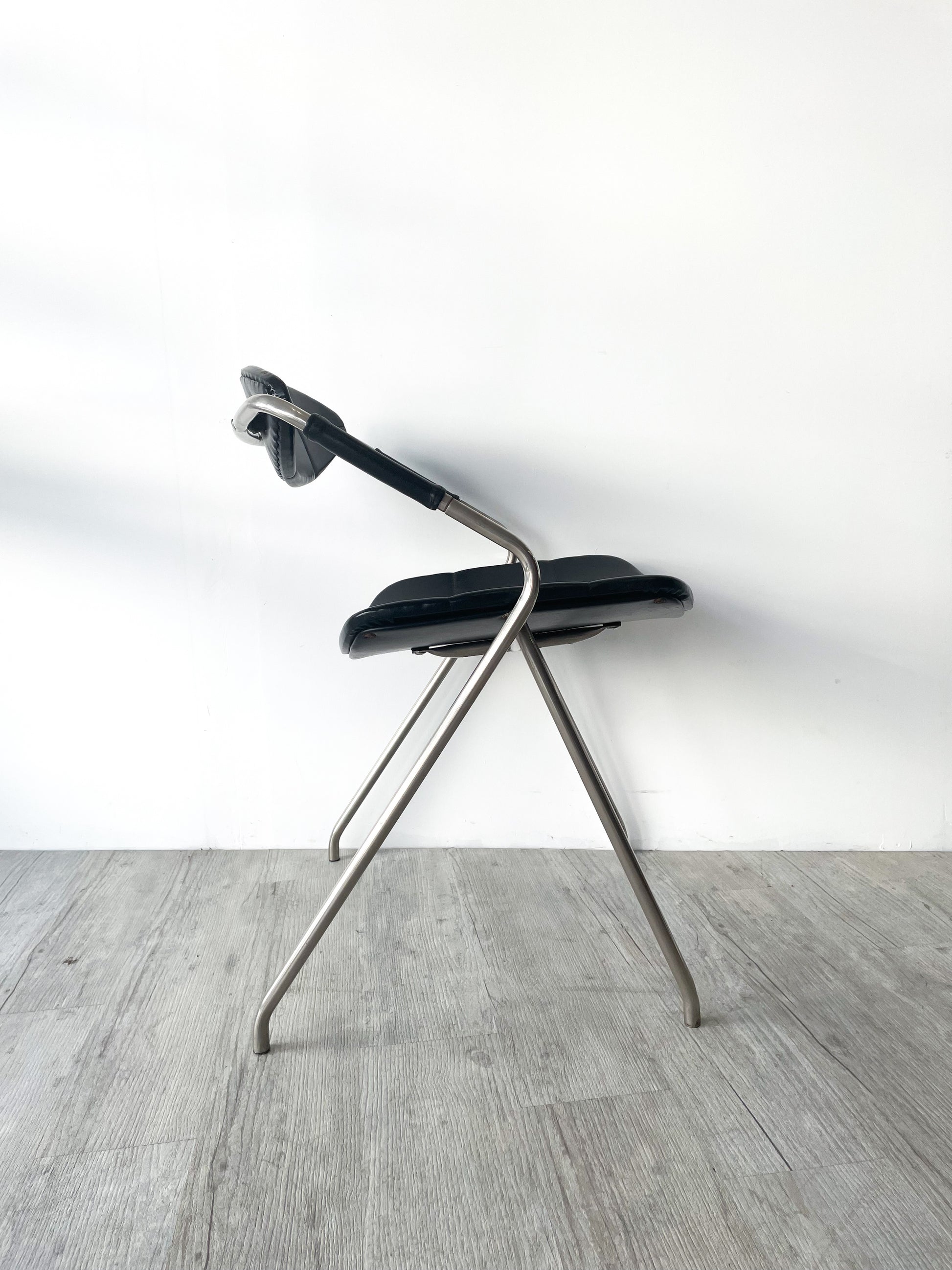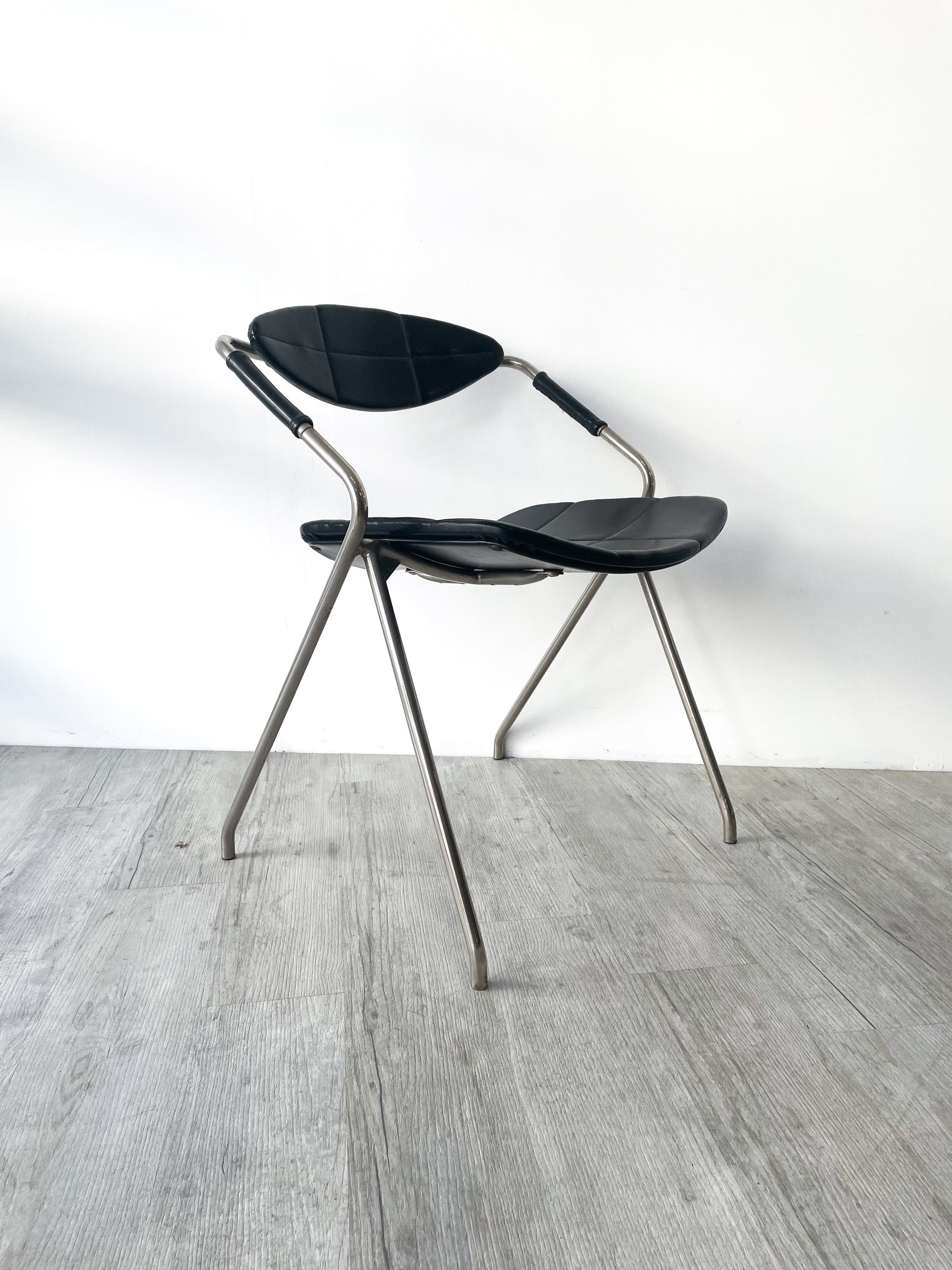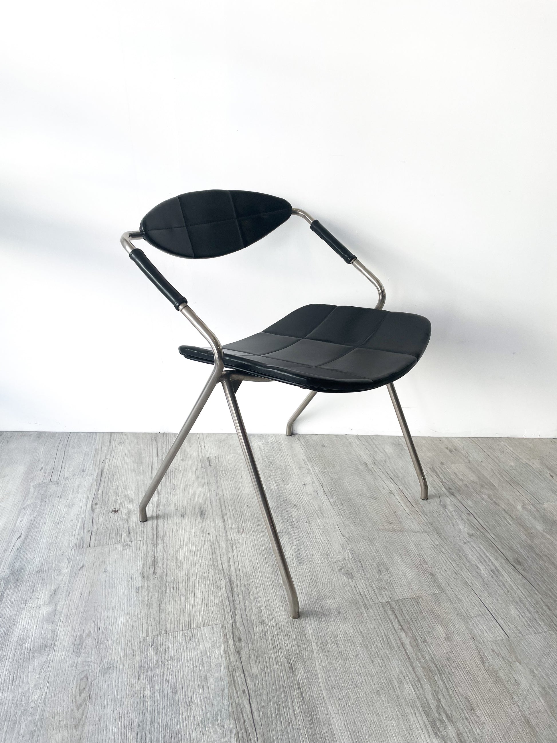 Très joli modèle pour ce fauteuil dit "Rugby" ou "Ellipse" signé Gilbert Steiner. Ce modèle de 1960 est une pépite de design, ses lignes sont parfaites, l'assise est vraiment confortable et bien profilée. La structure est en métal chromé, l'assise et le dossier dans un joli skaï noir.