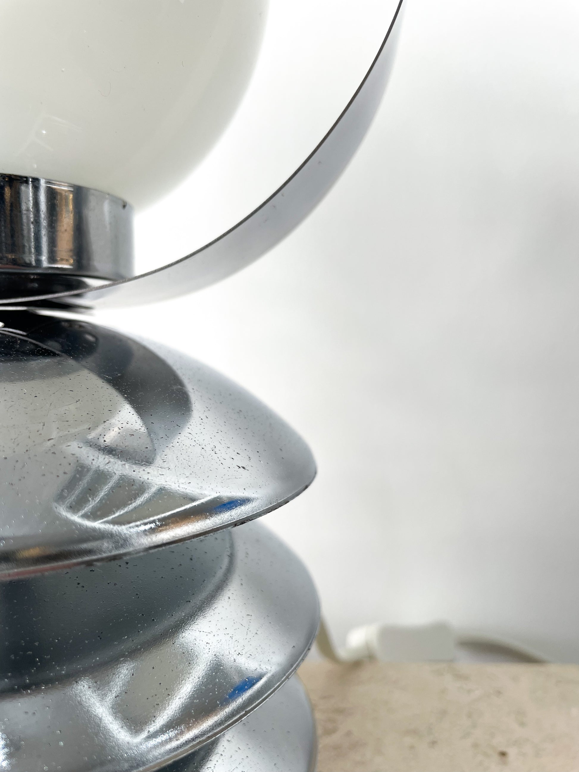 Joli lampe en métal chromé des années 70', dans le goût de Ingo Maurer. Grace à sa jolie boule en opaline, elle offre une lumière douce et élégante.