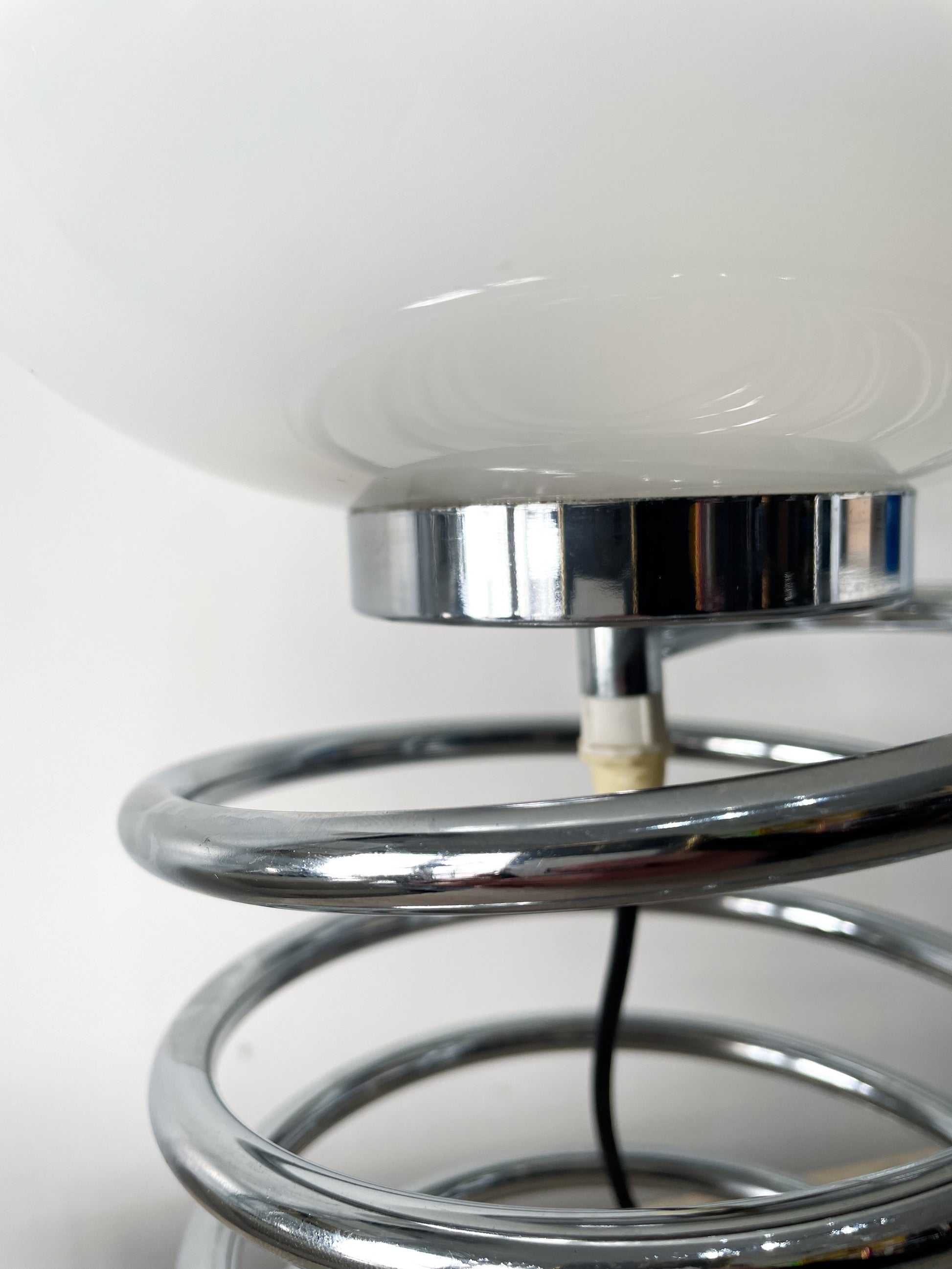 La lampe à ressort d’Ingo Maurer est une pièce emblématique du design des années 1970. Conçue avec une structure minimaliste et ingénieuse, elle se distingue piétement en métal chromé à forme de ressort, et son globe en opaline offrant une lumière douce et élégante. Son allure intemporelle s’intègre aussi bien dans un intérieur moderne que rétro.