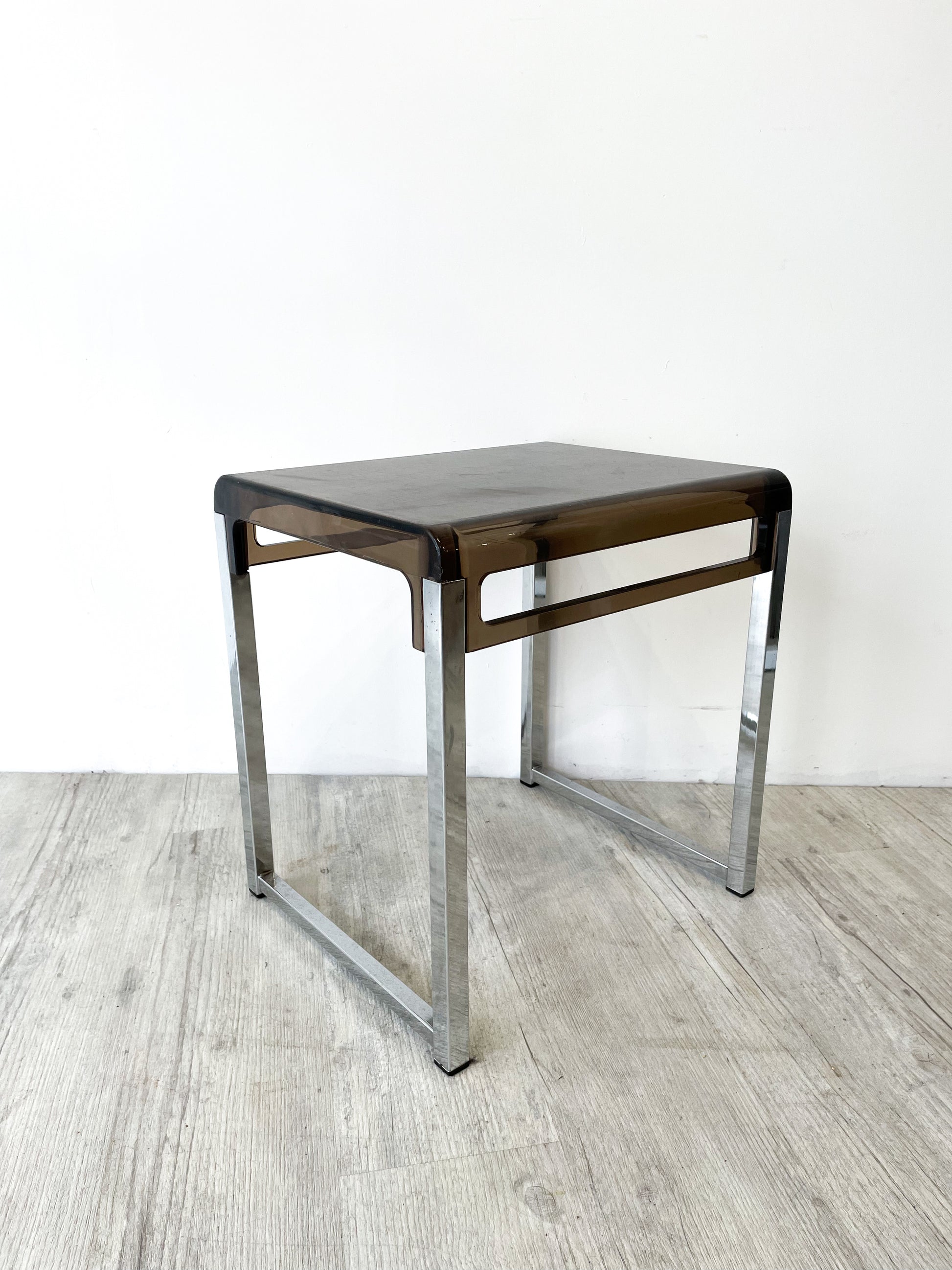 Joli petite table d'appoint des années 70' dessinée par Marc Berthier pour Prisunic. Le piétement est en métal chromé et le plateau en plexiglass fumé.