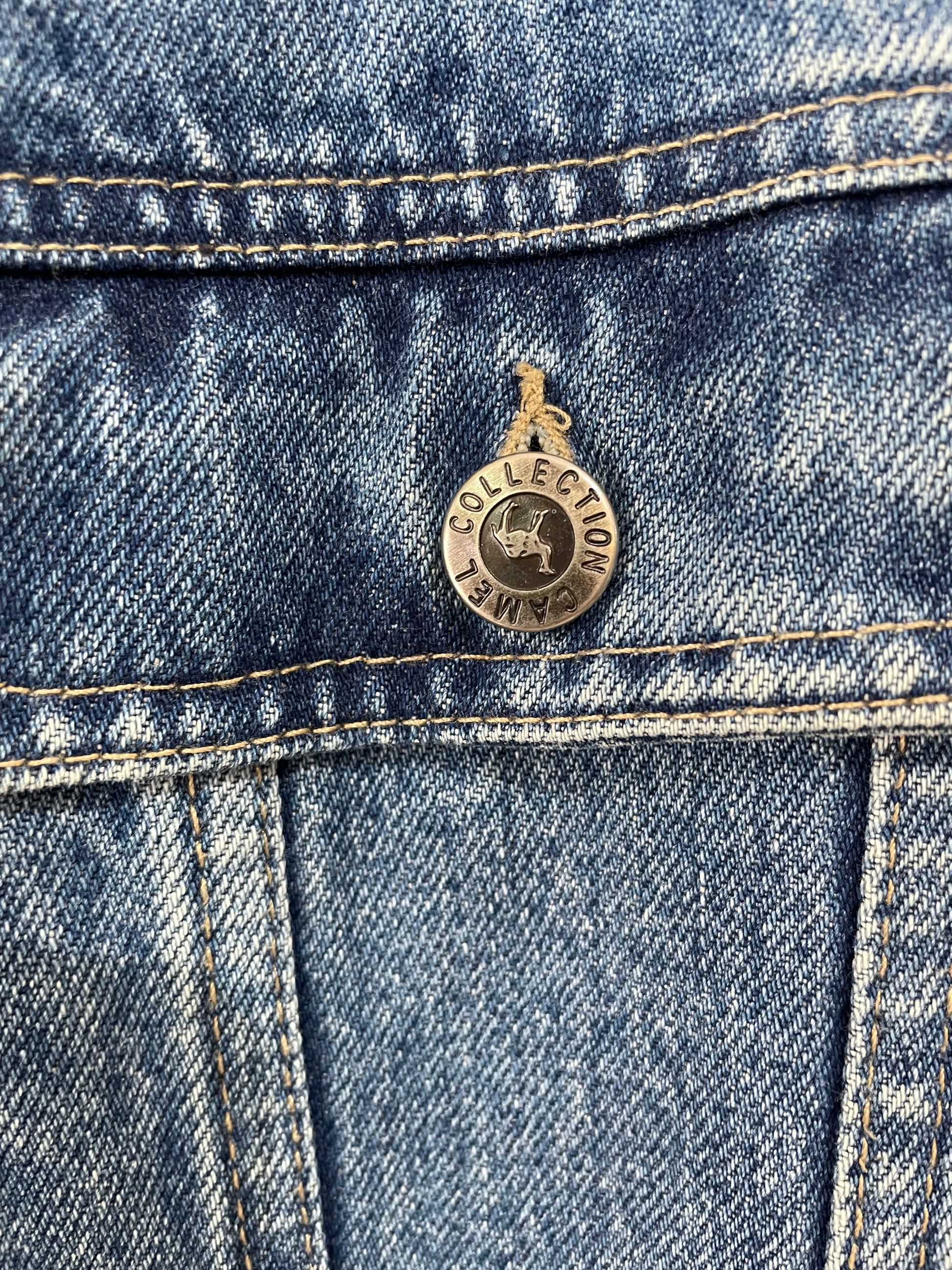 Pépite vintage des années 80's avec cette veste Denim de la marque Camel en parfait état. Ici on aime ses détails, son col en cuir joliment patiné, sa coupe, et sa robustesse.